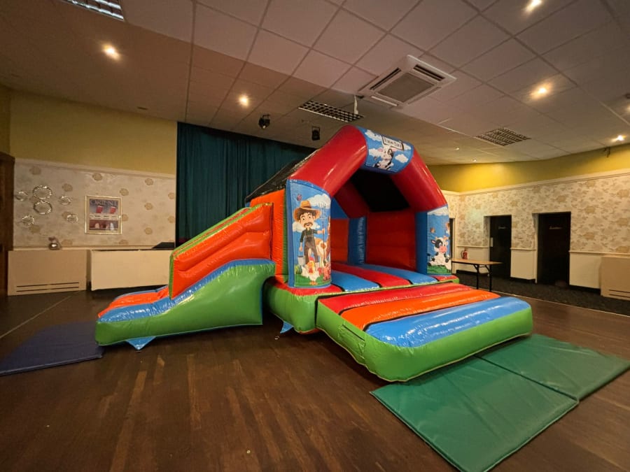 Midlands Inflatables love making your little ones dream parties come true and if your little one loves farming and everything to do with it then our 18x12ft Farm Yard Bounce and Slide Combi is the perfect choice for your farm yard theme party. The bright colours look great in gardens and venues and the beautiful artwork of Farmer Joe and all of his farm animals is the perfect way to get your little ones eyes lighting up with excitement. They can bounce into the farm and slide into the fun!