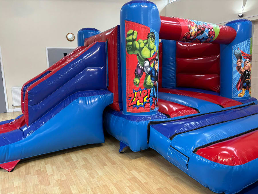 Midlands Inflatables know your little superheroes want to bounce alongside some of their favourite superheroes and we are able to make this happen. Our 18x14ft Low Height Cartoon Marvel Bounce and Slide Combi is the perfect choice to bring the action and adventure all in one bouncy castle. With the added extra of the slide this is a must have for your little ones superhero training. The colours of the castle make the artwork of the superheroes your little one loves so much pop and is a great way to bring the action to life. This castle is approximately 8ft tall and is designed to fit in most low height venues allowing your little one to experience the fun no matter the venue.