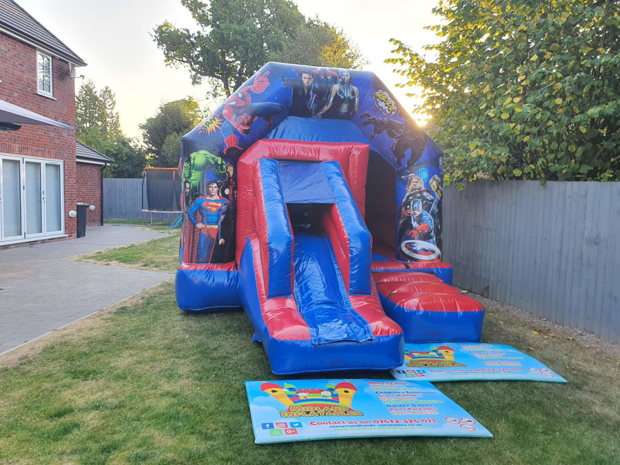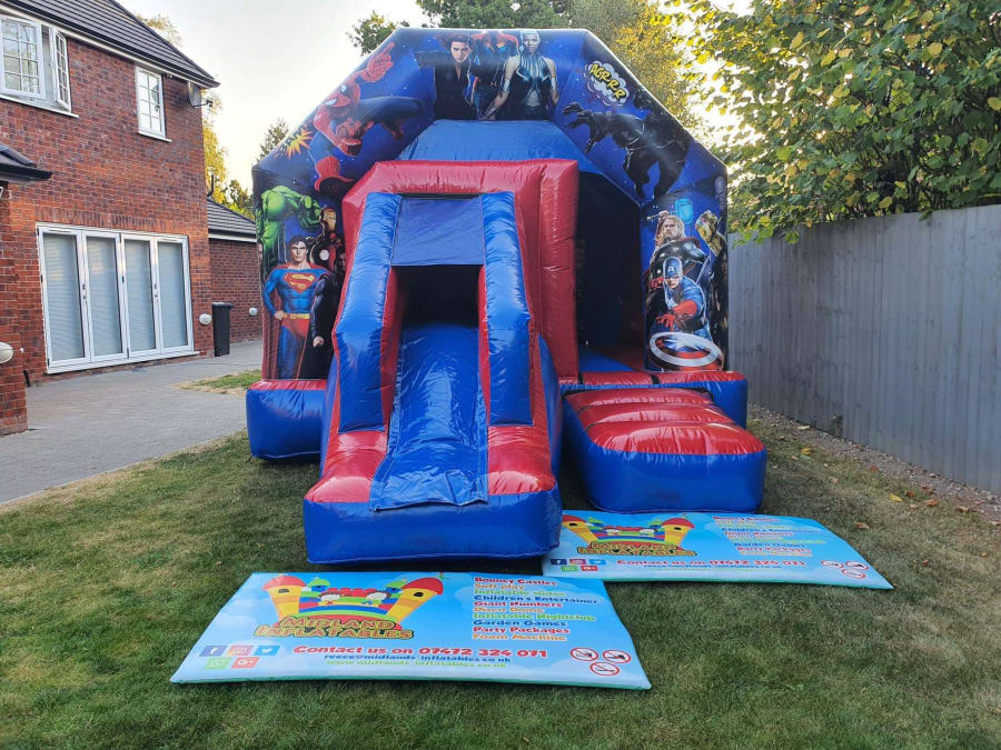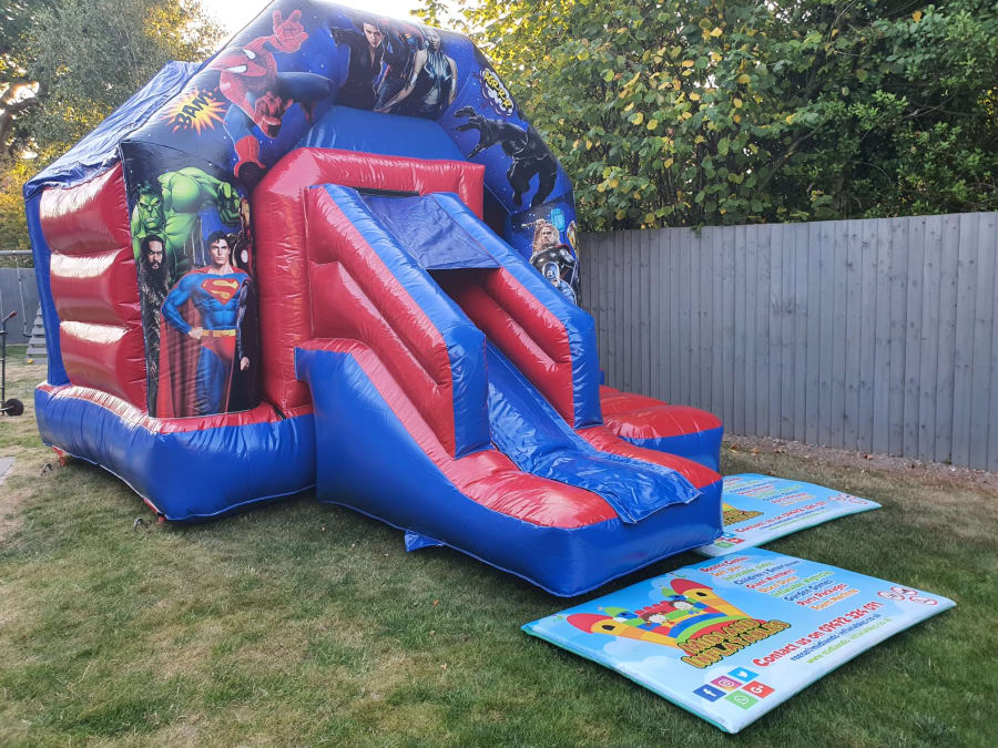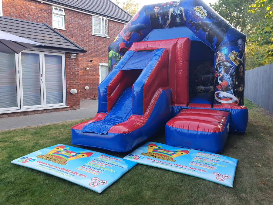 Our Marvel inspired bounce and slide combi is brightly designed and wonderfully coloured. All your favorite heroes are included on this bouncy castle, from The Incredible Hulk, to Captain America to Iron Man. Even some super villains you may not be so fond of are represented, from Poison Ivy to Thor and everyone in between! We know this is sure to create something of a chaotic atmosphere, to say the least! We just know using Midlands Inflatables for your next occasion will turn your fun party into Marvel madness and create super fun memories for your little ones (and maybe a few older guests too!)