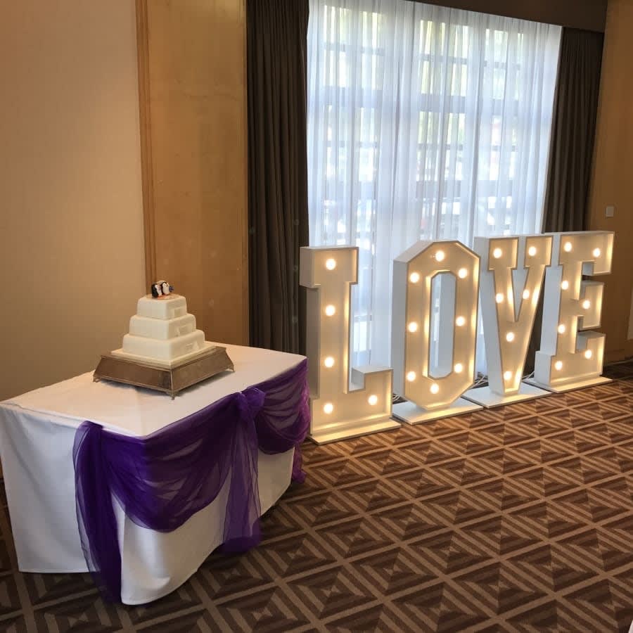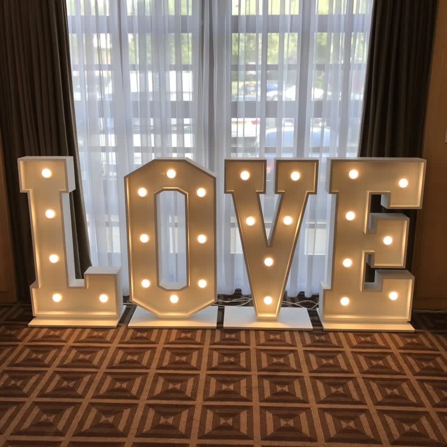 Our Giant Love Letters are in a vintage style with a matte white finish. With the beautiful illuminating warm glow of the golf ball bulbs, they will give the wow factor to your venue. The letters are free standing and will give your event the warm romantic feeling. (Most letters are 4ft x 2ft wide and 15 watts)