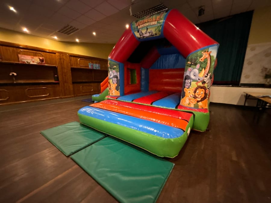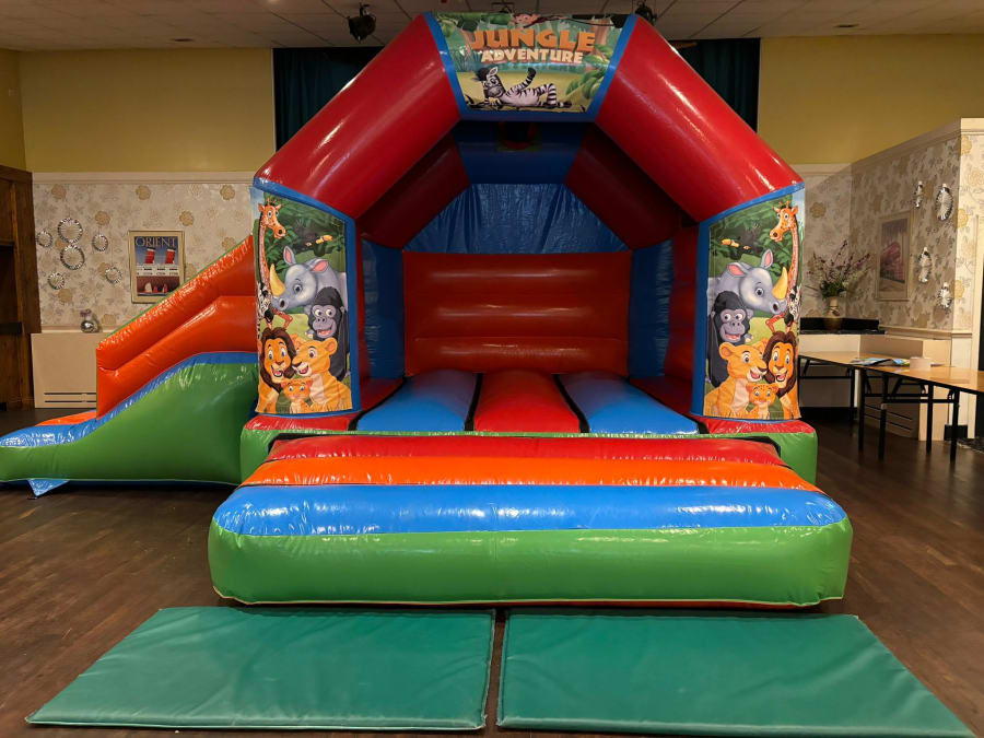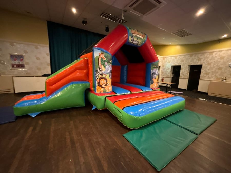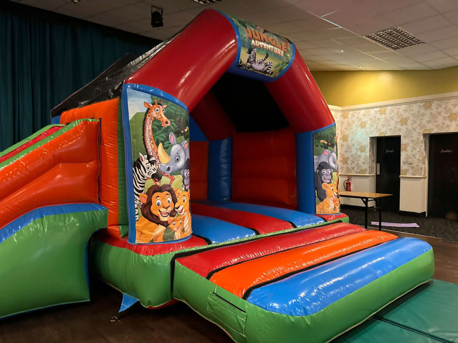 Time to bring the jungle fun to your little ones party with our 18x12ft Jungle DISCO Bounce & Slide Combi. With the open style castle making it easy to check if everyone is having a fantastic time and the added bonus of the slide we know your little ones will love this castle at their party. This castle also comes with a Bluetooth speaker too so your little ones can listen to their favourite music whilst bouncing and sliding into the jungle fun too!