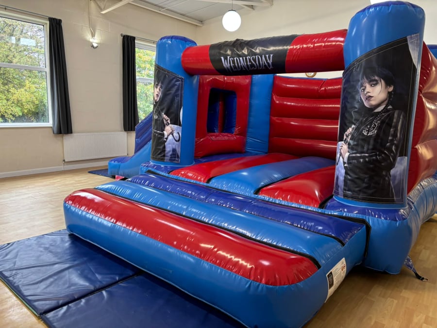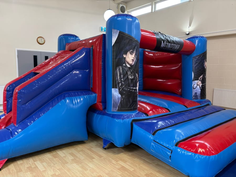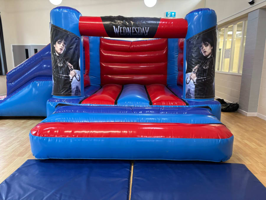 With Wednesday Addams becoming one of the most popular characters on television and not just at Halloween Midlands Inflatables have decided to bring the spookiness of this cooky family to life with our 18x14ft Low Height Wednesday Addams Bounce and Slide Combi. The beautiful artwork showcasing Wednesday in all her gothic glory this is a must have for your little one. This castle is designed to fit in all low ceiling height venues as it is approximately 8ft tall. With your little one bouncing into the cookyness of this family and sliding into the fun the options are endless.