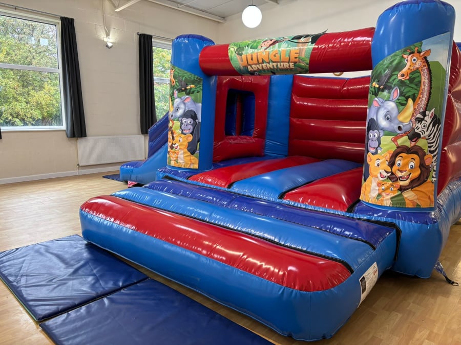 Does your little one love everything to do with jungle animals? Then Midlands Inflatables and our 18x14ft LowHeight Jungle Bounce and Slide Combi is the perfect choice to bring the fun to your Jungle Themed Parties! With the bright colours and beautiful artwork of some of your little ones favourite jungle animals such as the Lion, Giraffe and Monkey this is a must have for your little ones party whether it be a birthday party or even a christening. This castle is approximately 8ft tall and has been designed to fit in low height venues ensuring everyone can enjoy the jungle fun no matter where their party is being hosted.