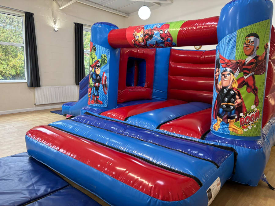 Midlands Inflatables know your little superheroes want to bounce alongside some of their favourite superheroes and we are able to make this happen. Our 18x14ft Low Height Cartoon Marvel Bounce and Slide Combi is the perfect choice to bring the action and adventure all in one bouncy castle. With the added extra of the slide this is a must have for your little ones superhero training. The colours of the castle make the artwork of the superheroes your little one loves so much pop and is a great way to bring the action to life. This castle is approximately 8ft tall and is designed to fit in most low height venues allowing your little one to experience the fun no matter the venue.