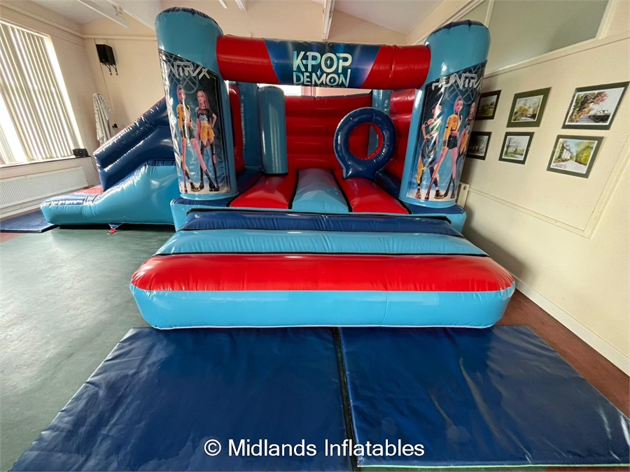 We know at Midlands Inflatables that K-Pop Demon Hunters is slowly taking over the world and your little ones love to have a K-Pop themed party which is why our 18x14ft Low Height K-POP Activity Bounce and Slide Combo is the perfect choice to bring the fun to your little ones party. The colours are bright and the artwork is striking with the three most popular girls your little one loves. With the added extra of the donut and bish bash within the castle itself this gives your little one and their friends hours of fun. Whether they are having fun or battling the supernatural this is a great way for your little ones to be demon hunters in training in full effect.